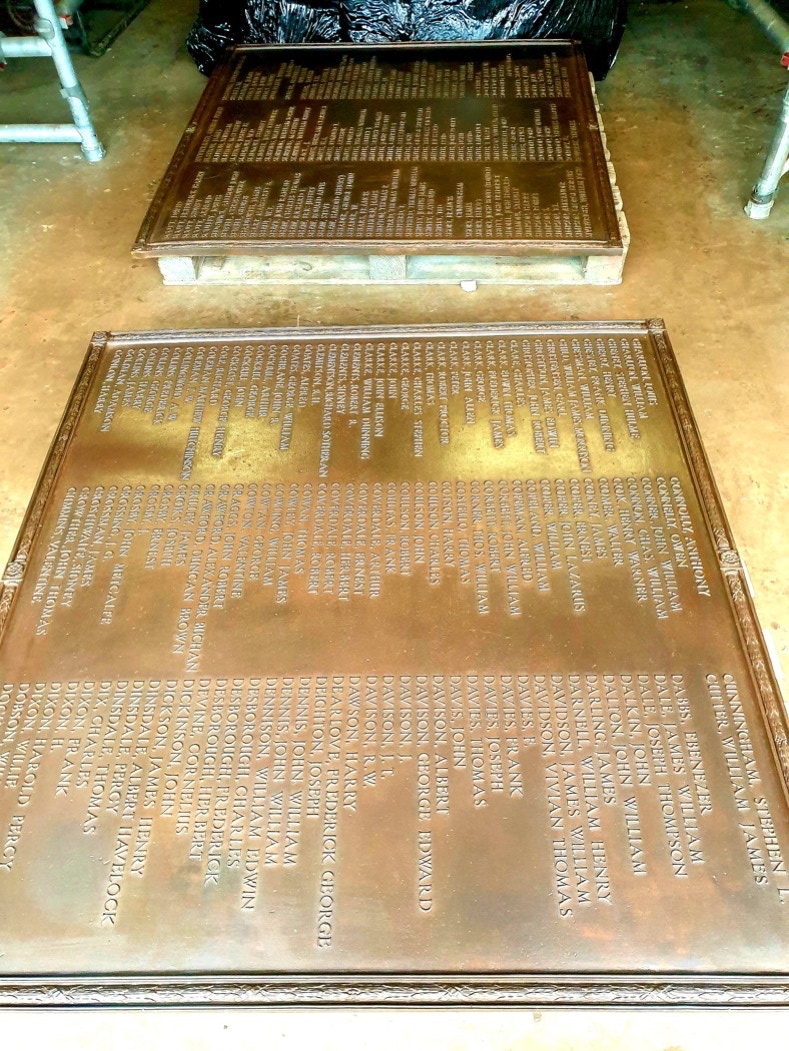 World War I and II memorial plaques were removed for additional names to be added etc , then a machine clean and we carried out our BMA ( Bronze Metal Antiquing ) method to Finish.